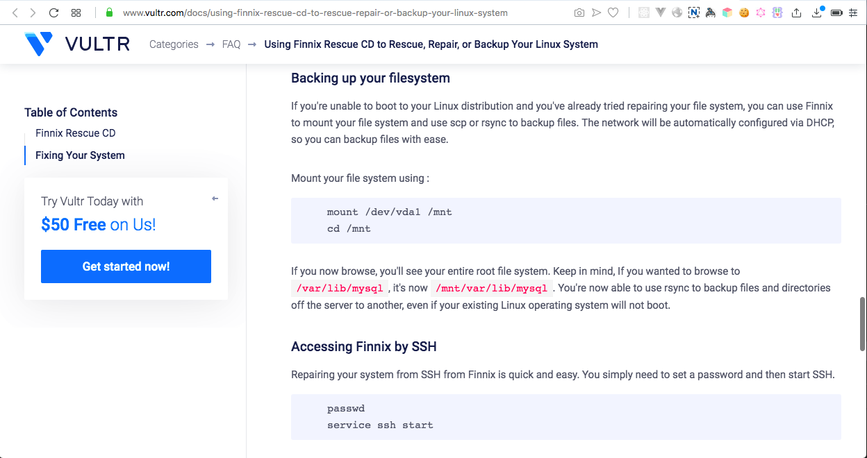 - Recover data from unbootable ubuntu - Boot to Finnix rescue cd, activate ssh server, recover data using sftp. See: Vultr blog post (or see snapshot).
